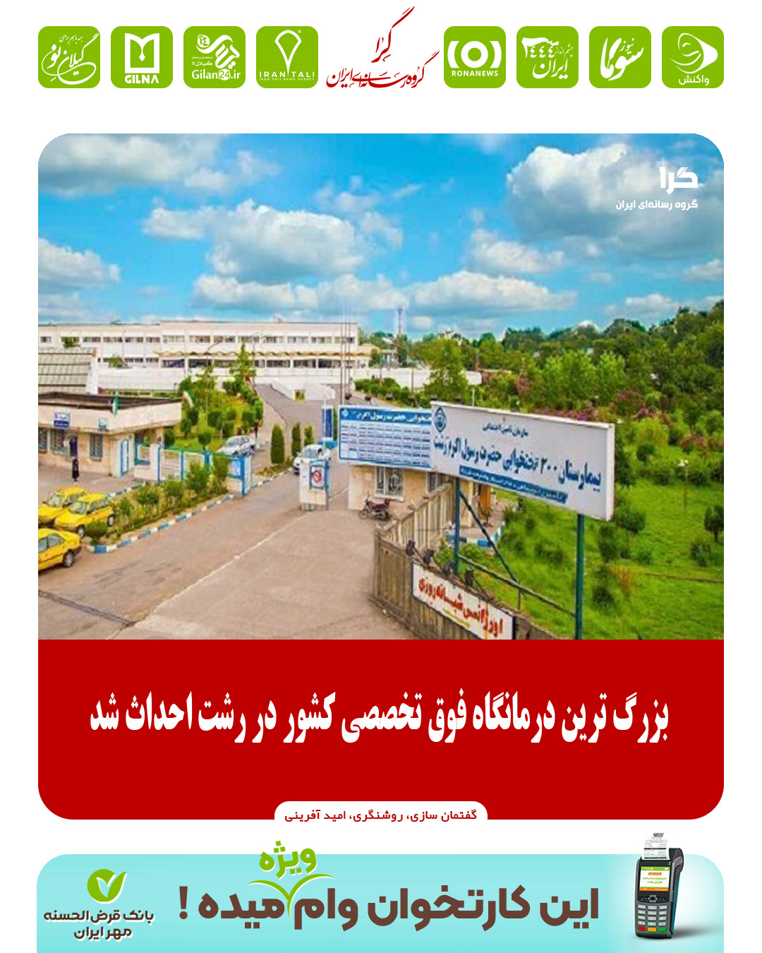 مدیر درمان تامین اجتماعی گیلان از اخذ سند بیمارستان رسول اکرم بعد از دو دهه خبر داد و گفت: زمین بیمارستان ۲۰ هکتاری است و در فاز اول، احداث بزرگترین درمانگاه فوق تخصصی کشور را در دستور کار داریم؛ البته مجوز های فاز های اول، دوم و سوم از وزارت بهداشت و وزارت تعاون، کار و رفاه اجتماعی اخذ شده، اما با مشکل کاربری زمین مواجه هستیم که درمانی نیست.