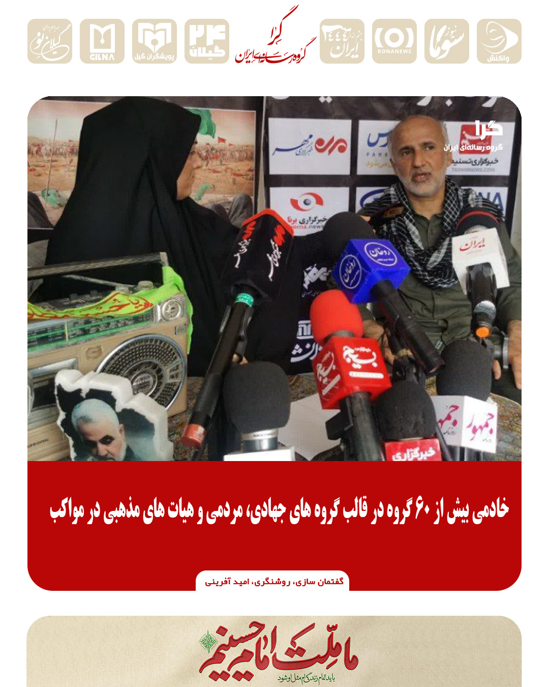 وی از فعالیت بیش از ۶۰ گروه جهادی در قالب گروه های مردمی ، پایگاه های مقاومت و هیات های مذهبی گفت و تصریح کرد: از صبح روز اربعین بالغ بر ۶۰ گروه جهادی و پایگاه های مقاومت مواکب دست به دست هم دادند تا صحنه های معنوی را رقم بزنند./