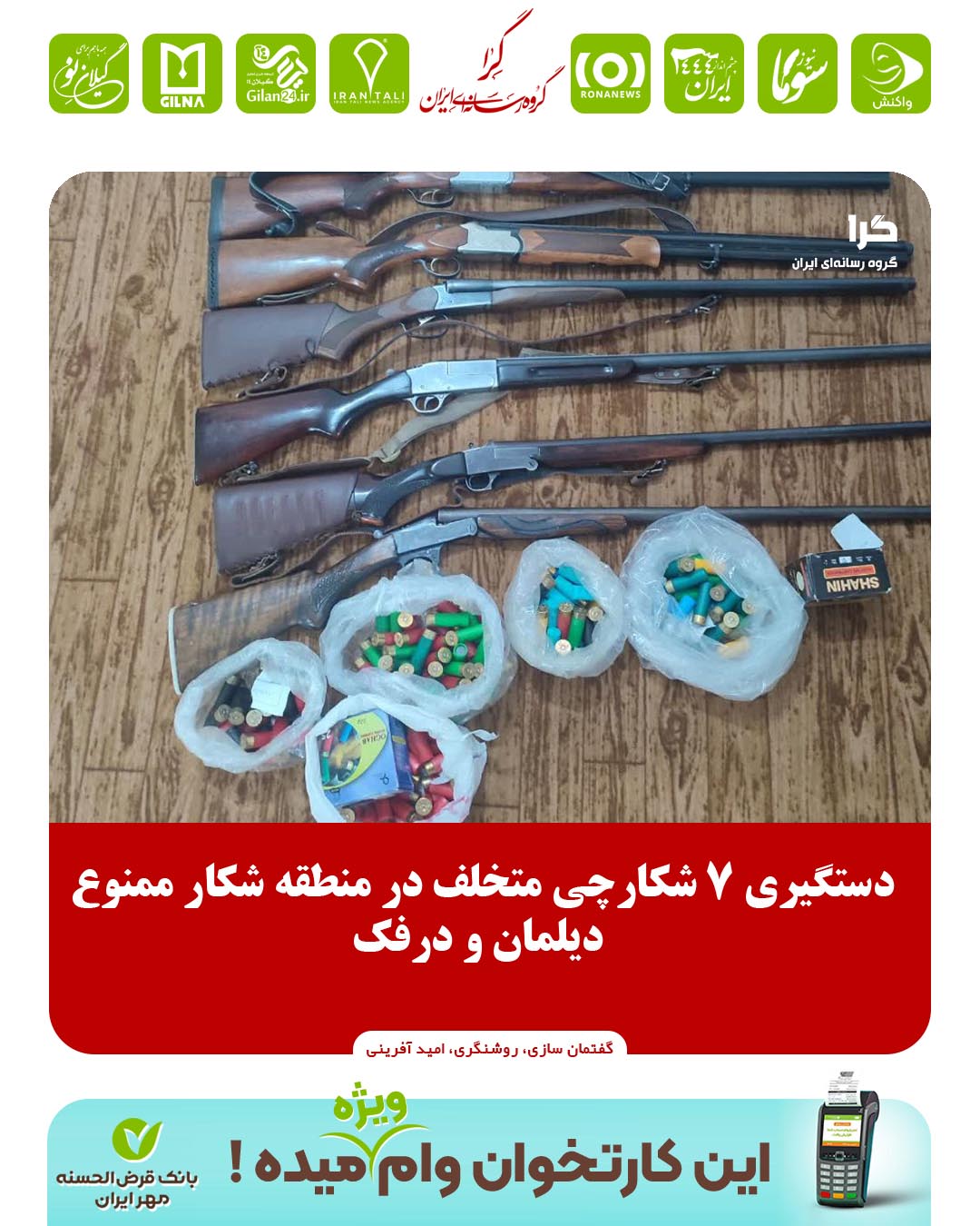 به گزارش گروه رسانه ای ایران – گرا؛ به گفته یوسف رهنما؛ محیط بانان یگان حفاظت محیط زیست شهرستان سیاهکل در پایش منطقه شکار و صید ممنوع دیلمان و درفک موفق به شناسایی و دستگیری هفت نفر متخلف با هفت قبضه سلاح شکاری شدند.