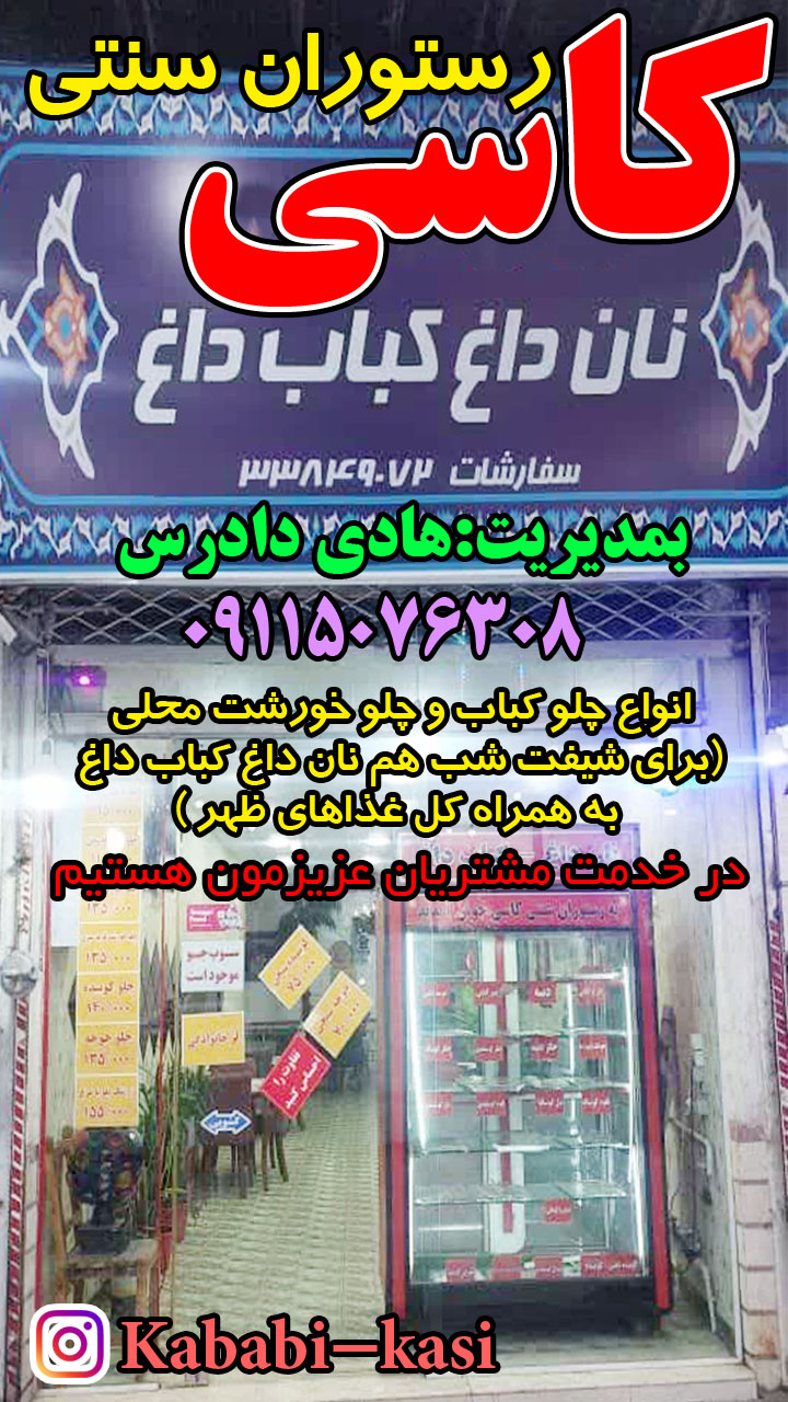 انواع چلو کباب و چلو خورشت محلی برای شیفت شب هم نان داغ کباب داغ به همراه کل غذاهای ظهر در خدمت مشتریان عزیزمون هستیم به مدیریت: هادی دادرس رشت جانبازان خیابان شهدا نرسیده به تامین اجتماعی جنب پل عابر رستوران کاسی ۰۱۳۳۳۸۴۹۰۷۲ تلفن مدیریت ۰۹۱۱۵۰۷۶۳۰۸ اینستاگرام: @Kababi-kasi