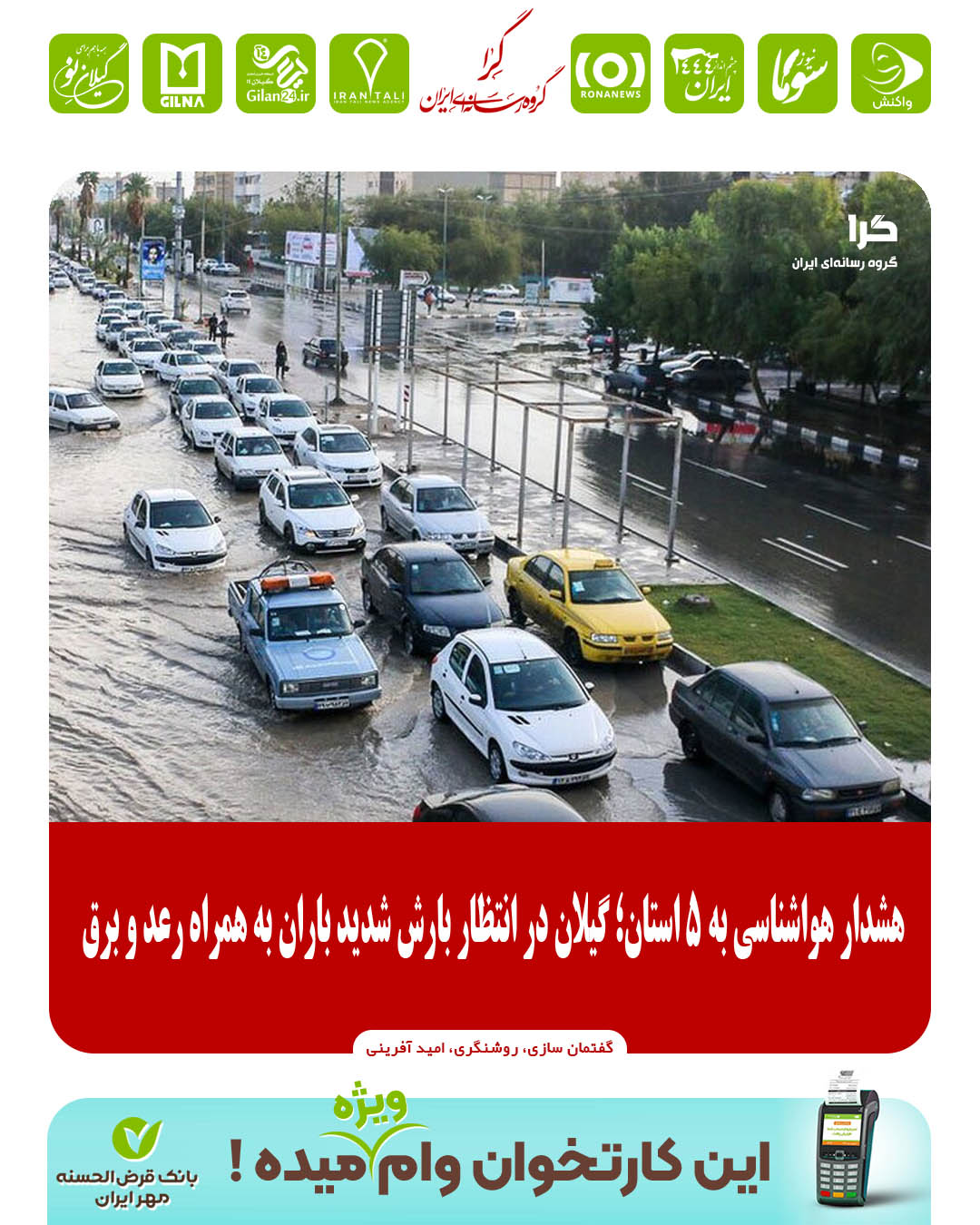 رییس مرکز ملی پیشبینی و مدیریت بحران مخاطرات وضع هوای سازمان هواشناسی اضافه کرد: جمعه (۳۰ شهریور) در شمال غرب و گیلان رگبار و رعد و برق و وزش باد شدید موقتی رخ خواهد داد. شنبه (۳۱ شهریور) در شمال استان های آذربایجان غربی و آذربایجان شرقی، برخی مناطق اردبیل و گیلان ابرناکی و رگبار و رعد و برق پیشبینی میشود.