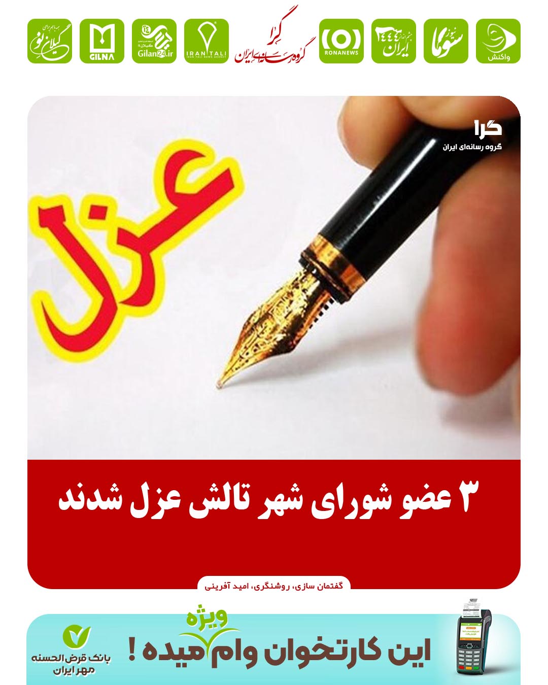 به گزارش گروه رسانه ای ایران – گرا؛ با حکم فرماندار تالش ۳ عضو شورای شهر این شهر عزل و افراد جایگزین معرفی شدند. آقایان «سهیل سلامی»، «احمد قلعه کفایی» و «حمید صمدی» جایگزین بهزاد پور پناه، عبدالله حسین پور و وحید یوسف زاده شدند.